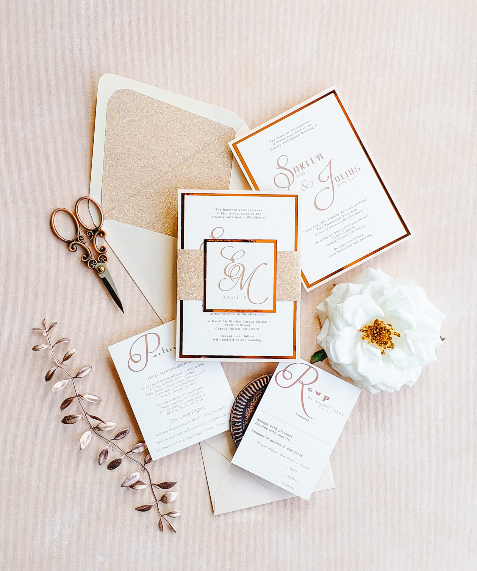 A set of beautifully designed invitations, RSVP cards, and envelopes for weddings, parties, or corporate events.